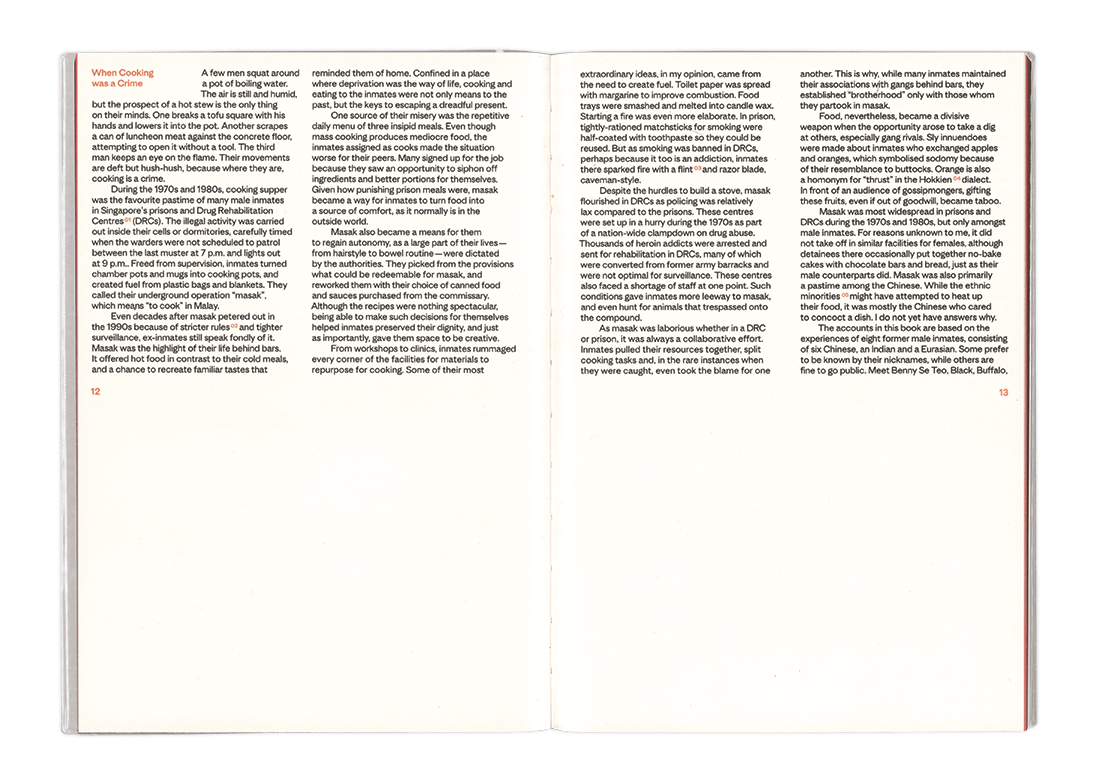 Durante las décadas de 1970 y 1980, en las prisiones y Centros de Rehabilitación de Drogas de Singapur (CRDs), cocinar era una tarea desafiante e ilegal para los reclusos masculinos. A pesar de los obstáculos, ingeniosamente encontraron maneras de alimentarse utilizando recursos poco convencionales como orinales y mantas.